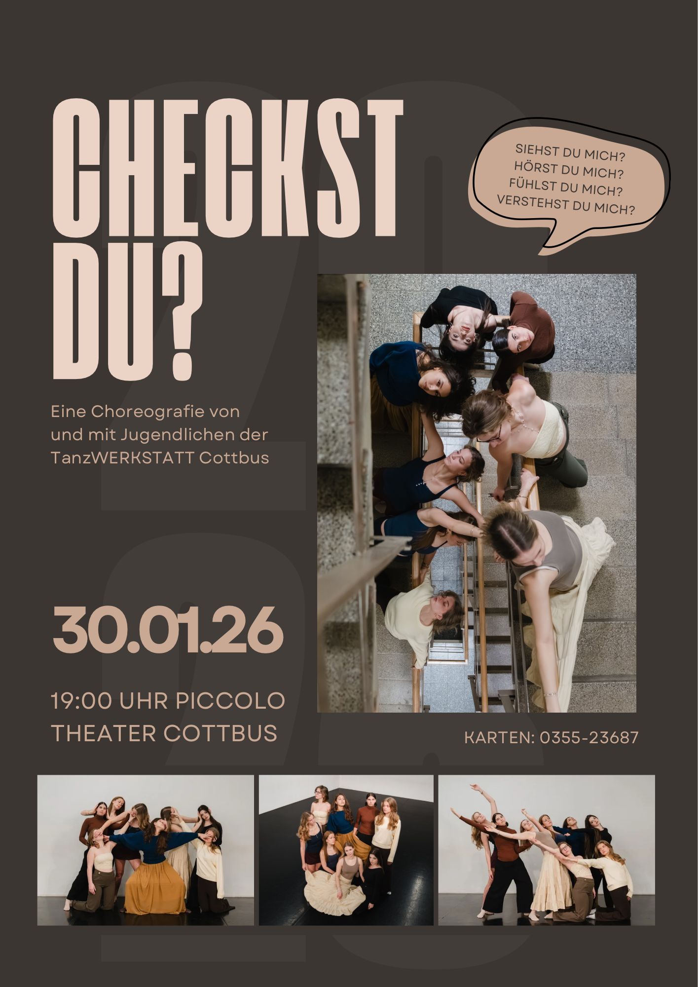 „Checkst du?“, dem neuen Stück von Jugendlichen der TanzWERKSTTT statt! Ort: piccolo Theater Cottbus,